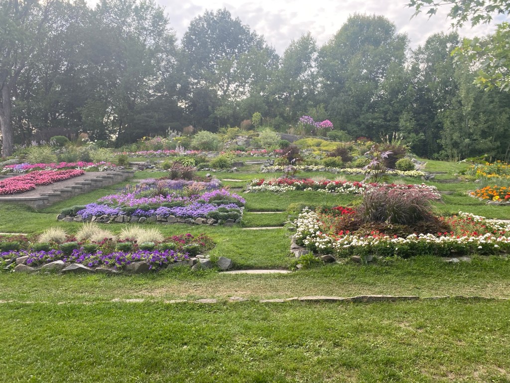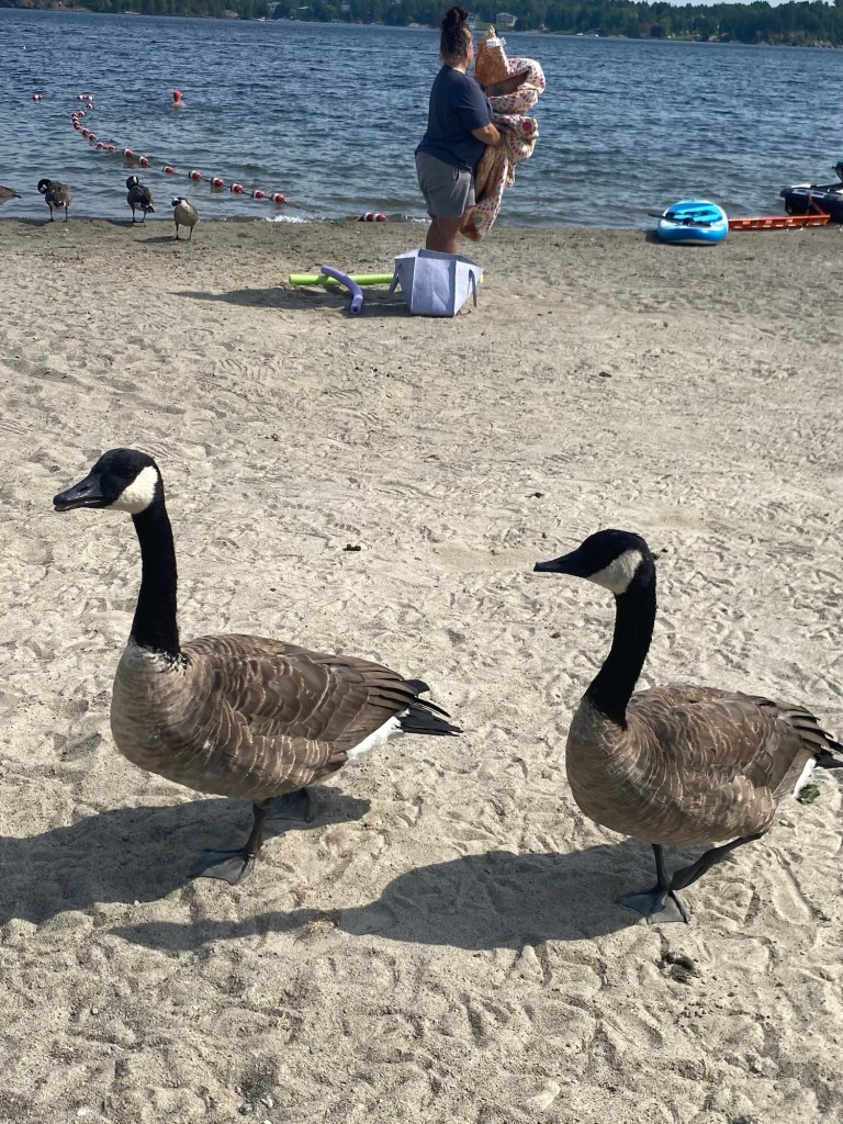 Sur la route du retour, nous revisitons le parc Bell à Sudbury. Depuis notre passage au printemps, les fleurs ont poussé et sont harmonieusement disposées.Les petits des bernaches sont devenus adultes et on ne peut les distinguer de leurs ainés. Nous rencontrons un couple super sympathique de Laval qui ,comme nous, voyage en VR du nom de Jolen et Yves. Nous partageons nos expériences de voyages respectives.