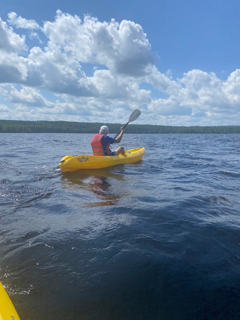 Le kayak , quelle aventure, une campeuse m’avait parlé d’une petite chute sur une rivière de l’autre côté de la rivière des Outaouais, à peu près 5 km du camping. Quand nous débutons le kayak, le vent soufflait de face avec une vague d’au moins 30cm. Après 1km, Gilles rebrousse chemin car sa douleur dorsale augmente avec la position dans le kayak et préfère ne pas empirer sa condition. Je continue donc seule en cherchant l’embouchure de la rivière; je me guide sur la morphologie des arbres lointains pour m’orienter. J’arrive enfin à cette rivière où l’eau calme m’enchante, la vraie nature. Je progresse aisément à la recherche de cette chute qui m’avait tant motivée. Après chaque petite baie aucune chute en vue. Après deux heures de kayak , j’ai dû calmer mon ambition et rebrousser chemin car ma location se termine deux heures plus tard. Au retour, le courant et la vague m’aident à retraverser la rivière mais arrivée de l’autre côté, je ne retrouvais pas l’ile en guise de référence du camping, j’ai dû longer la côte à contre courant et affronter la vague pour arriver à la plage où je suis partie. Pendant ce temps, un peu découragée, j’ai pensé à mon père qui me parlait des flots comme des défis à relever. J’arrive enfin au grand plaisir de Gilles, fière d’avoir fait 12km de kayak.